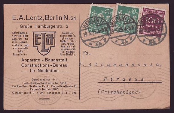 画像は、時間が浮いたので、部屋に積み上がったものを整理し始めたとたんに出たもの。1923年5月19日ドイツからギリシャ宛の外国葉書。ドイツインフレで、外国葉書収集は意外と難しく、全料金期間の完収がまだ。ギリシャ宛なのがミソで、ヨーロッパ内でもちょっと見かけないもの。そして、何故か、外国葉書で面白い宛先が少しずつ集まっている。スペイン、ブルガリア、エストニア、リトアニア、パレスチナ、ブラジル、チリなどである。但し、全料金期間完収でないし、料金期間にも偏りがある。外国葉書だけで、全料金期間を様々な宛先で揃えたワンフレームを作ってみるのも悪くないかも。 |