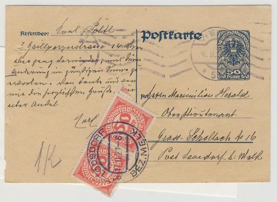 画像は、巨大魚群の中で見かけたちょいとしたもの。1921年2月1日に国内葉書料金が50ヘラーから100ヘラー(=1クローネ)値上げとなったが、その2月16日に旧料金50ヘラーで差し出したため、不足料金50ヘラーの倍100ヘラーの不足料金を徴収したもの。ドイツインフレでは、不足料切手がないが、オーストリアインフレではこのような不足料切手が楽しめる。なお、オーストリアでは葉書の消印のように薄くで読みづらいのが通常で、不足料切手に押印されたのは少なく食指が動く。一匹だけなら狙うのだが、ロットの中なので、思案中。 |