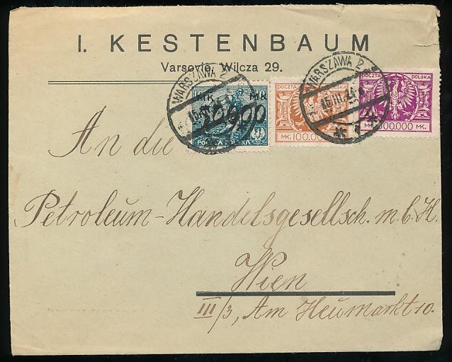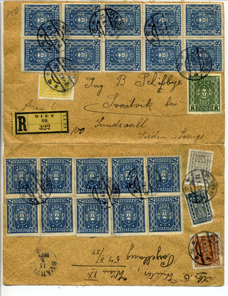 画像は、巨大魚群が去った後、魚群に釣られたのか、一匹で泳いでたのを、意地で釣った物。オーストリアインフレで最高額となってしまもた。スウェーデン宛の二倍重量書留で、ご覧の通り重量感がある。ドイツではこのような重量感が珍しくないのだが、オーストリアではこれだけ多数貼られ、消印などもしっかり入っているのは、日本の終戦前後で消印の読めるものを探すほどの難度ではないが、似たような難しさがある。 |
