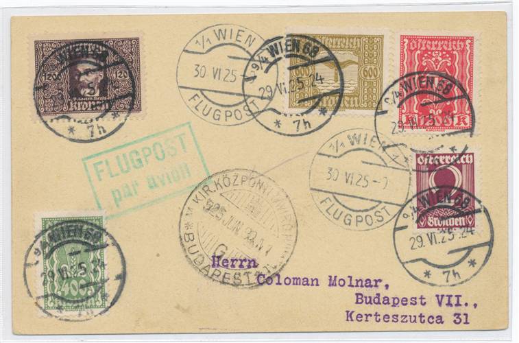 1925年6月29日ブタペスト宛の航空葉書。明らかに郵趣家が作成したもの。だからパスしていた。実際、裏は何も書かれていなかった。フィラテリックなので鮮明な消印。航空便は人気が高く、この葉書もオーストリアとしては安くない方。新旧混貼で、右下の数字"2"の切手が新通貨で、その他が旧通貨。更に、旧通貨の航空切手が2種貼ってあるが、有効期限が今の所分からず、火種にと仕込んだ。 |