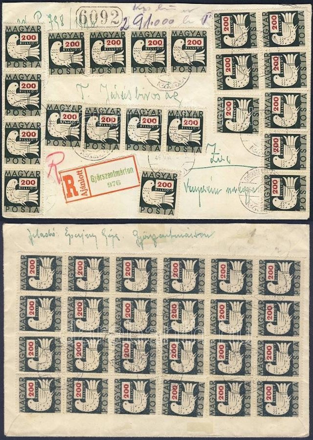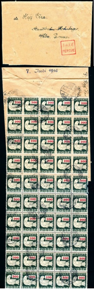 世界最高額面は、ハンガリーのハト切手50京となっているが、郵便料金の変更により郵便に使えなくなってから出現したので、実際に郵便に使えたのは、10京となる。それも出現は1946年7月11日で、翌日7月12日より使えなくなったので、1日だけの使用となる。国内書状書留は、30京で10京3枚貼となる。今回の外国書状は40京で10京4枚貼。4枚を超える多数貼は知られていないという。その最高額面10京の最多4枚貼すなわち40京は、1つの郵便に貼られた総額面で最高金額、という代物。但し、切手展に出すには、ちょっと不安がある。偽造が容易だからである。もし、従来から知られている有名なものであれば大丈夫なのだが、そうでなければ、鑑定書が必要となる可能性が高くなる。これは、実物が届いてから考えることにする。 なお、このカバーが売りに出されたのは3回目。1回目は大ロットの中に紛れ込んでいたが、ロット自体がフロア特有の熱気で競り上がったのか、理解できない落札値となった。2回目は単独で出たが、最低値が高過ぎ。高額落札の元を取り戻そうという魂胆がミエミエ。我慢していたら、不落札で今回の出品となり、最低値も妥当なものだった。