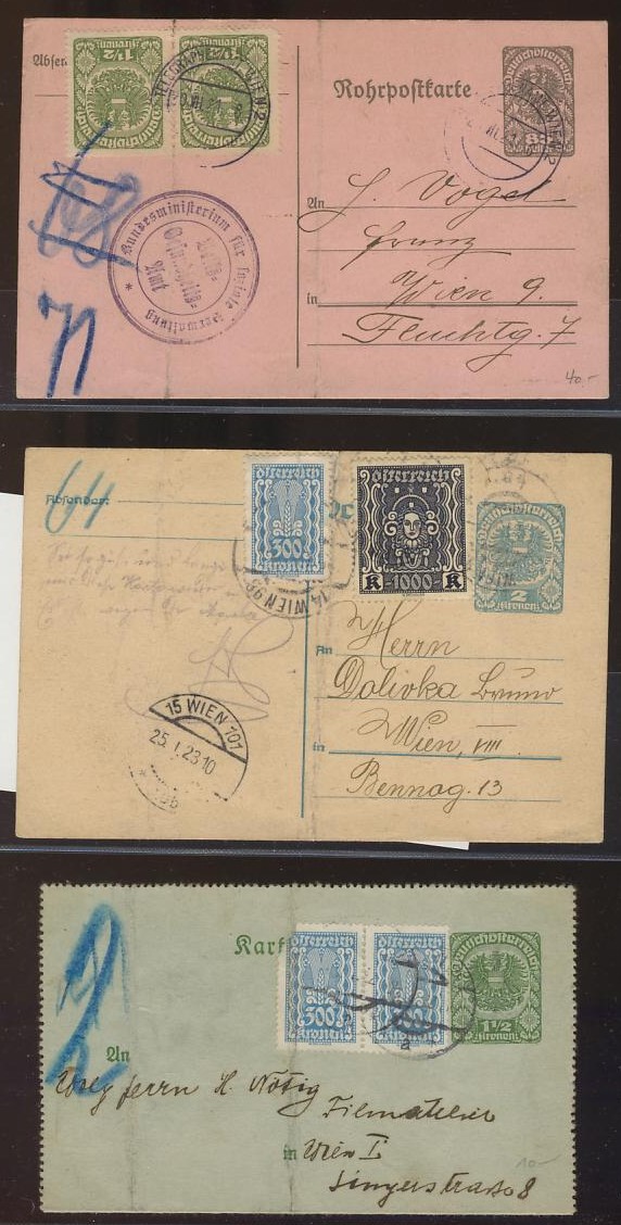| オーストリアカバー3通到着。以前から感じていたけど、チェコスロバキアでも、オーストリアと同様に書留や速達に着印を押すということになってないようだ。オーストリアインフレ期、チェコスロバキア宛のみ、国内料金と同一料金→外国郵便料金→外国郵便料金より割安、と変遷していて、料金上は面白いのだが、カバー自体の面白みに欠けて、ちと扱いにくい。 |