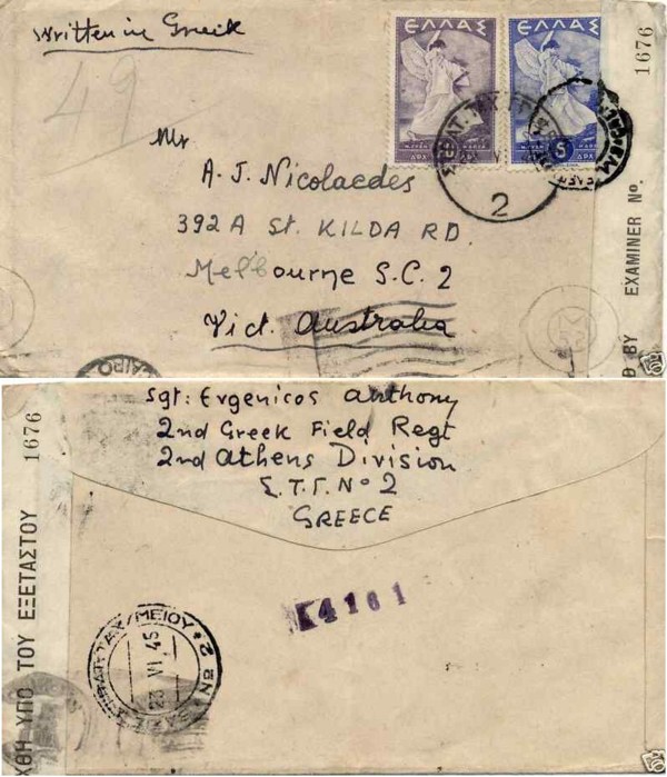 画像は、1945年6月ギリシャからオーストラリア宛書状。パナマよりは弱いがちょっと珍しい宛先。パナマ宛が手に負えないと書いたら、10ドル台で、はらりとゲット。よく見かける料金なので、平凡なものかもしれない。パナマの方が珍しいのかも。 |