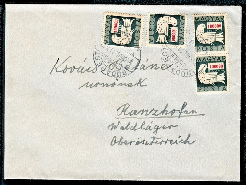 画像が、最大級の大物のそれ。1946年7月11日ハンガリー・ブタペストからオーストリア・Ranzhofen(Ranshofen?)宛の外国書状。貼付のハトは、10京(100,000兆)ペンゲーで4枚貼は師匠によればユニーク、すなわち確認1点だそうだ。こういうのは、隠して展示会で初公開し皆を驚かせるのも一手で、今年の全日展での偽造菊切手貼カバーがそれだった。しかし、ハンガリーインフレのようなマイナーなものは、事前に大騒ぎしないと見向きもされないだろうだから、ここでささやかに騒ぐ。^^;; |