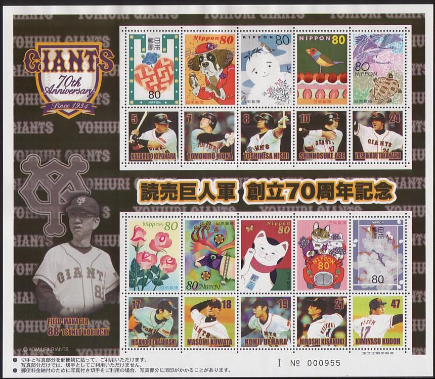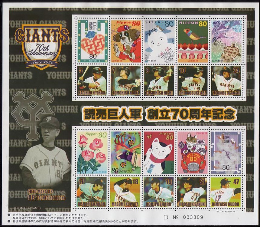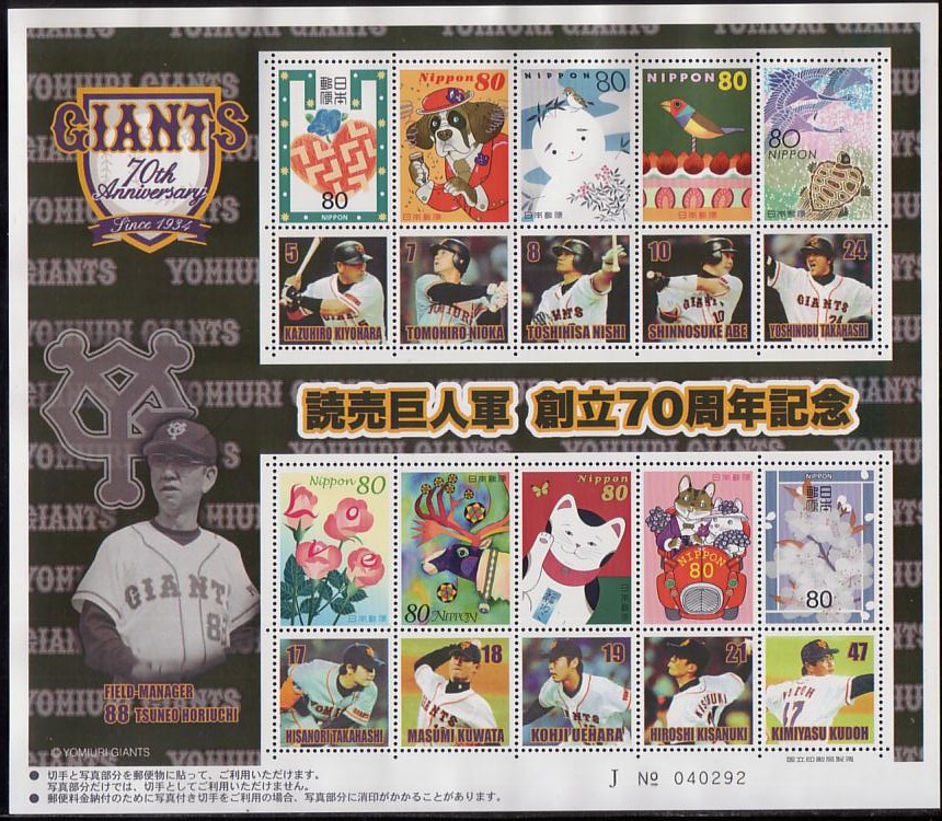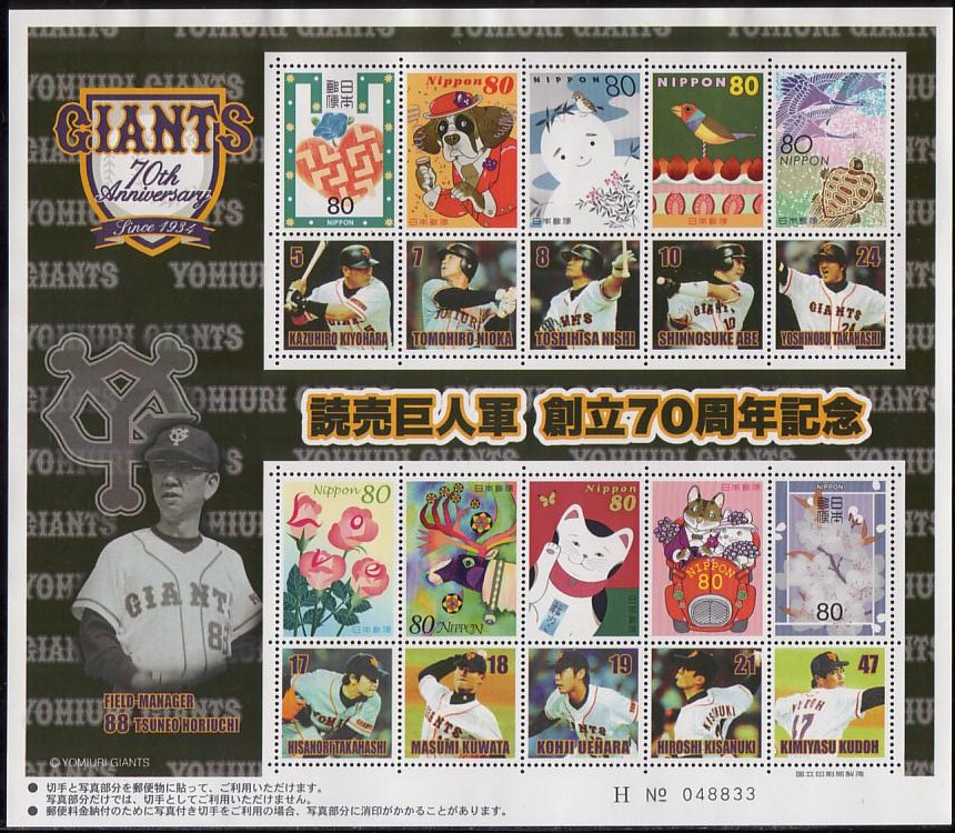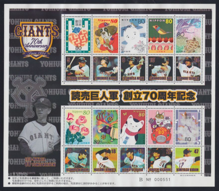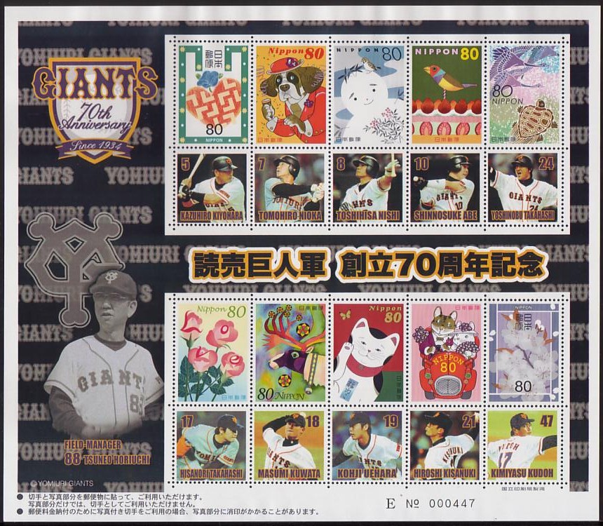 製作数は、一般発売の「読売巨人軍創立70周年記念」と合わせて、50万シートと言われる。一般販売は「P−スタンプカタログ1」(株式会社 鳴美)によれば、1000シートなので、499000シートあることになるが、はっきりしたことは不明。写真付き切手(10面)は、オリジナル版でも、1000シート作成が大半であり、その数百倍に相当する大量作成は、まさに、池の中のクジラであり、10面写真付き切手(のり式)の受付停止を早めた模様である。