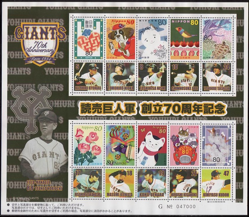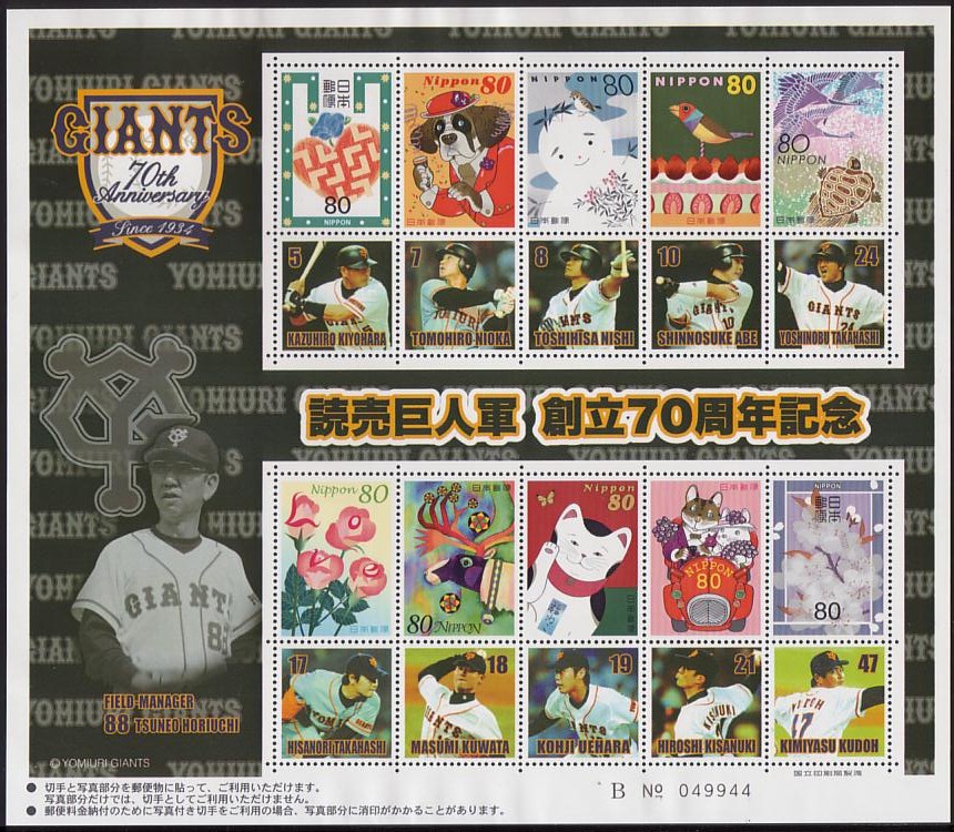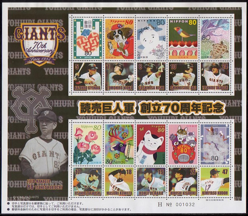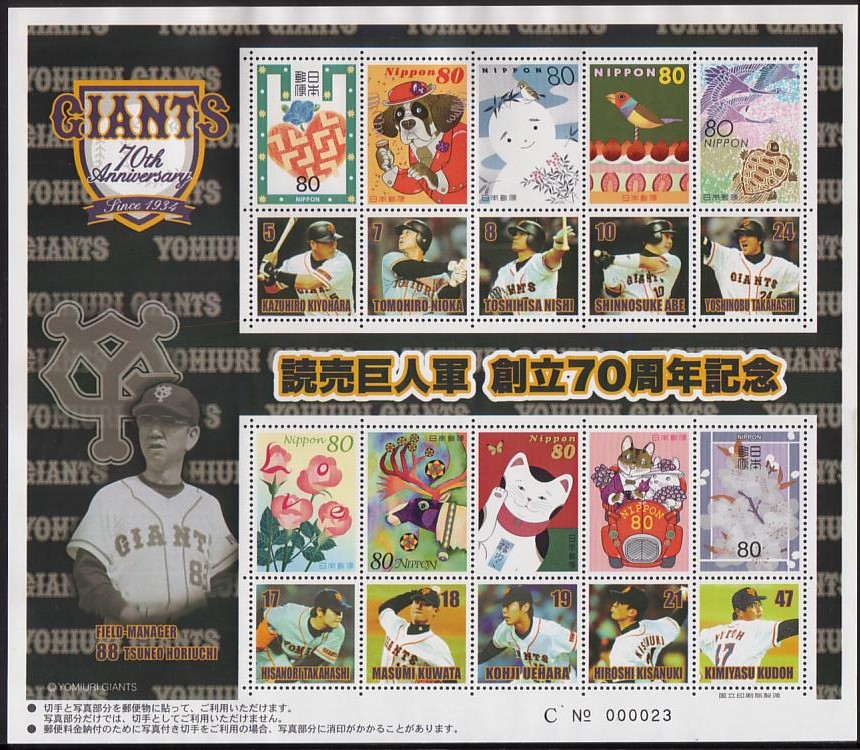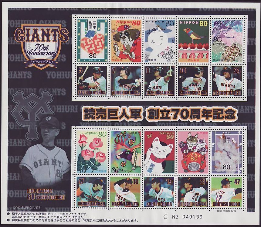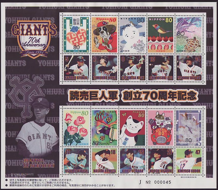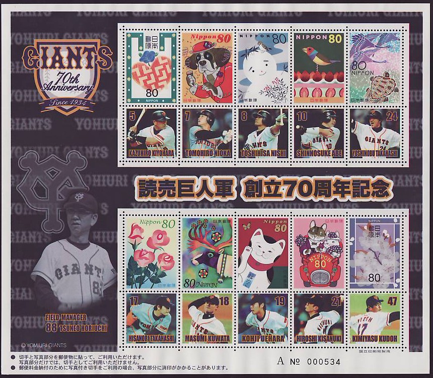 製作数は、一般発売の「読売巨人軍創立70周年記念」と合わせて、50万シートと言われる。一般販売は「P−スタンプカタログ1」(株式会社 鳴美)によれば、1000シートなので、499000シートあることになるが、はっきりしたことは不明。写真付き切手(10面)は、オリジナル版でも、1000シート作成が大半であり、その数百倍に相当する大量作成は、まさに、池の中のクジラであり、10面写真付き切手(のり式)の受付停止を早めた模様である。